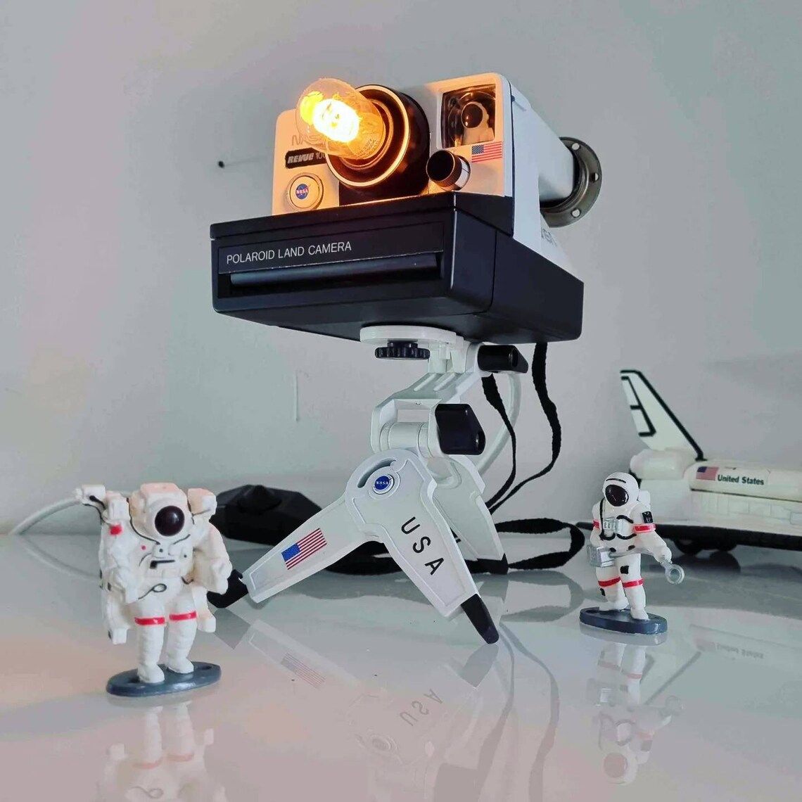 Original Polaroid Land Camera Revue 1001 von 1979 mit Dreifuß-Stativ klein in Individuallackierung "Space Shuttle" reinweiß-schwarz und original NASA Optik, dimmbare E14 LED-Birne Spirale mini, Stromkabel reinweiß ummantelt, mit Schnurrdimmer und Schuko-Stecker in schwarz.